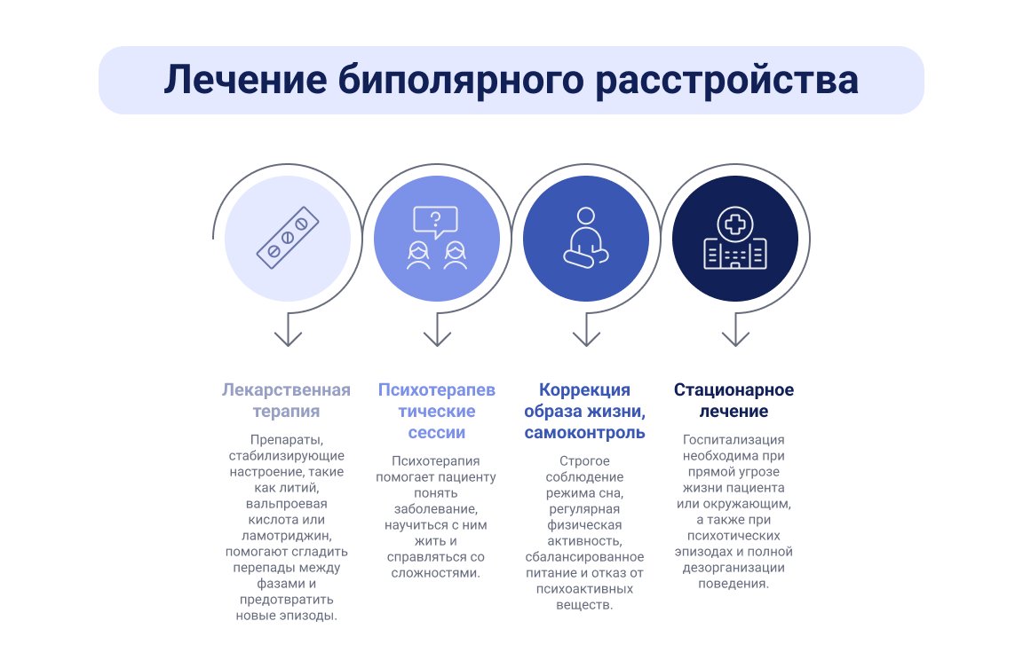 Основу терапии составляют препараты, стабилизирующие настроение. Врач может назначить нормотимики — такие как литий, вальпроевая кислота или ламотриджин.